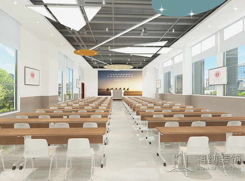 設(shè)計(jì)理念:該案例是嶺南學(xué)院清遠(yuǎn)校區(qū)行政辦公樓設(shè)計(jì)裝修項(xiàng)目,為了使行政樓更好地作為服務(wù)和辦公場(chǎng)所,設(shè)計(jì)師根據(jù)使用需求將一層設(shè)計(jì)為多功能綜合服務(wù)大廳;二層為校企合作基地,對(duì)外辦公;三層作為行政職能辦公室;四層為校領(lǐng)導(dǎo)、核心職能部門(mén)辦公室,對(duì)內(nèi)辦公;五層作為會(huì)議室和檔案室,用于內(nèi)部使用。這樣的規(guī)劃設(shè)計(jì)合理,各區(qū)域既聯(lián)系又互不影響,很好地將校內(nèi)外人員分流,最大程度地利用全部空間。天花圓形造型與線(xiàn)條組合,構(gòu)造出“宇宙星空軌跡”,飛機(jī)造型吊燈寓意學(xué)生以嶺南學(xué)院為起點(diǎn),學(xué)有所成,飛向?qū)儆谒麄兏髯缘念I(lǐng)域。墻面以護(hù)墻板裝飾,既起到保護(hù)墻體的作用,又與整體風(fēng)格相呼應(yīng)。