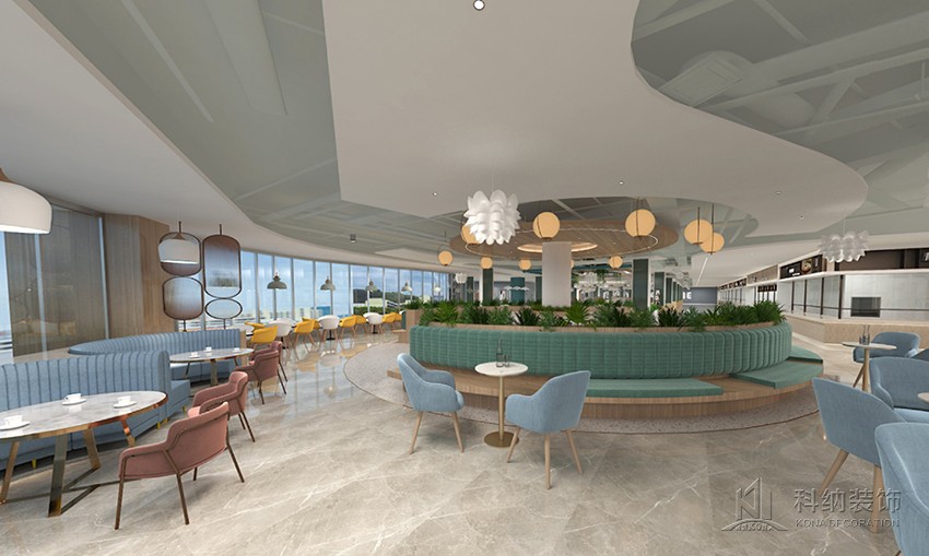 設(shè)計理念:空間設(shè)計力在突破傳統(tǒng)食堂形式,表達(dá)校園食堂快樂食間品牌意識,傳遞快樂食間價值觀。為學(xué)生和老師提供有品位的就餐環(huán)境,享受美食之外還具有學(xué)習(xí)、聚會、獨處的空間功能。整體空間在以白色為主基調(diào)的設(shè)計中,將天花裝飾藍(lán)色,柱子選用了一點墨綠色進(jìn)行點綴,以注入環(huán)保、科技、自然等元素,呈現(xiàn)出美感與實用兼?zhèn)涞膭?chuàng)新設(shè)計。木質(zhì)桌椅溫潤自然,大盆綠植規(guī)律擺放,搭配錯落有致,整個空間自然開闊。
